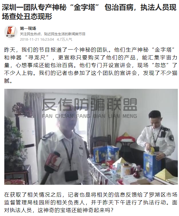 2018年11月,深圳媒体曾曝光瑞宏能量金字塔涉嫌虚假宣传,随后深圳罗湖区市场监督管理局执法人员查封了瑞宏能量在深圳的体验中心,面对执法人员的质问,自称瑞宏能量公司总裁的鞠姓男子称自己的产品是普通装饰品。