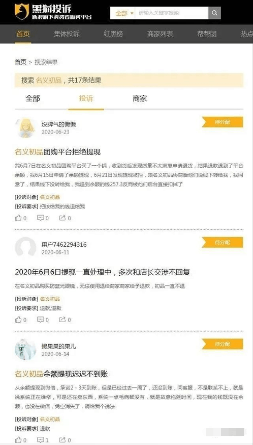 小编在黑猫投诉平台检索到多人投诉“名义初品”平台存在取消订单不退款、退货不退款、禁止提现、不发货等问题。