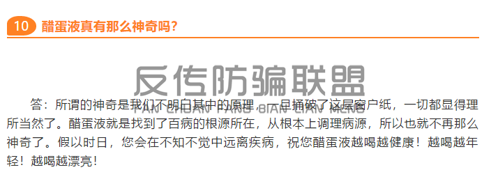 反传防骗联盟留意到一个名为“共生源益生菌醋蛋液宝典”的公众号中发布了大量有关“共生源复合乳酸菌固体饮料”和“共生源低聚肽醋蛋液”的软文。其中一篇名为《醋蛋归元液,你来问,我来答》一文中详细阐述了共生源醋蛋归元液的“神奇功效”: