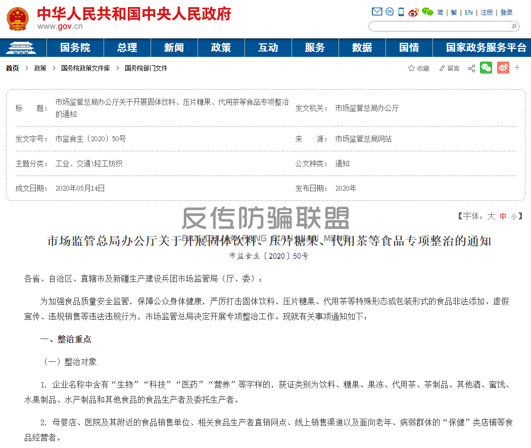 今年5月14日,国家市场监督管理总局官网发布《市场监管总局办公厅关于开展固体饮料、压片糖果、代用茶等食品专项整治的通知》。该通知中指出:为加强食品质量安全监管,保障公众身体健康,严厉打击固体饮料、压片糖果、代用茶等特殊形态或包装形式的食品非法添加、虚假宣传、违规销售等违法违规行为,市场监管总局决定开展专项整治工作。