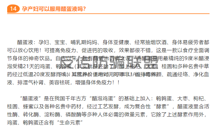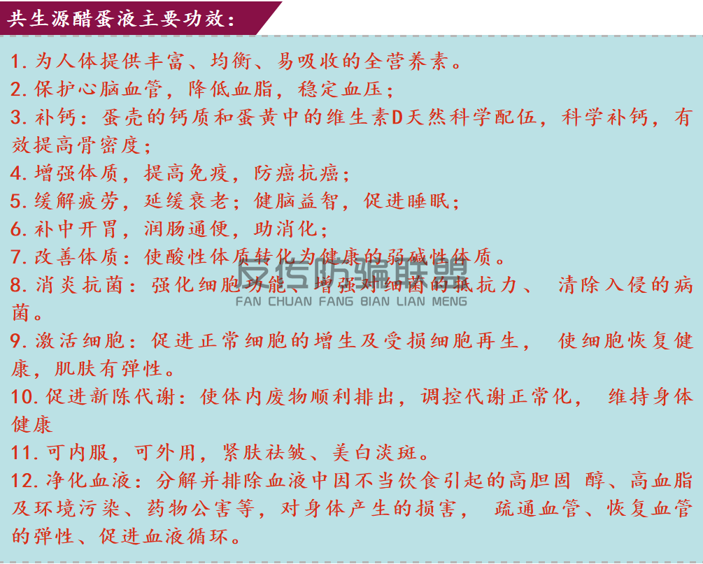 在对“共生源醋蛋液”的宣传中,该文毫不掩饰地宣称“共生源醋蛋液孕妇、宝宝、哺乳期妈妈、身体亚健康、经常抽烟饮酒、身体易疲劳者都可以放心饮用!可提高免疫力、促进钙的吸收,效果都很不错,这是一款以食疗全面调节身体的神奇饮品。自古以来,就有醋蛋治百病之说,而醋蛋是用最精纯的9度米醋浸泡受精21天的鸡蛋、鹌鹑蛋(其实就是胚胎了)加上枸杞、大枣、桂圆和多种名贵中草药经过低温20度发酵而成,其营养价值绝对无可厚非!能排毒养颜、疏通经络、净化血液、排湿气补肾、美容祛斑,增强身体免疫力!”