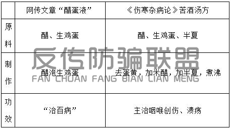 据上海网络辟谣平台报道,上海中医药大学附属岳阳医院中西医结合医师侯霄雷表示,《伤寒杂病论》里只有一张用醋和鸡蛋一起入药的方子,名为“苦酒(即醋)汤方”:半夏14枚,用水洗干净,切成枣核大小;鸡蛋1个,头部开一小孔,去掉蛋黄,把米醋加入其中;再把半夏加入装有米醋及蛋清的鸡蛋壳中,混匀,最后再放在火上煮沸。“苦酒汤方”主治咽喉部位受到创伤、溃疡,无法讲话等,服用时需去掉药渣,每次取小量含咽。