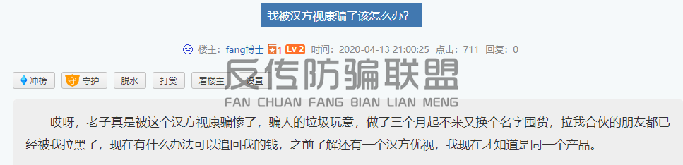 在网络上,有网友吐嘈称自己被汉方视康骗了,并透露“汉方视康”原名是“汉方优视”,由于没做起来所以改名为“汉方视康”继续囤货。