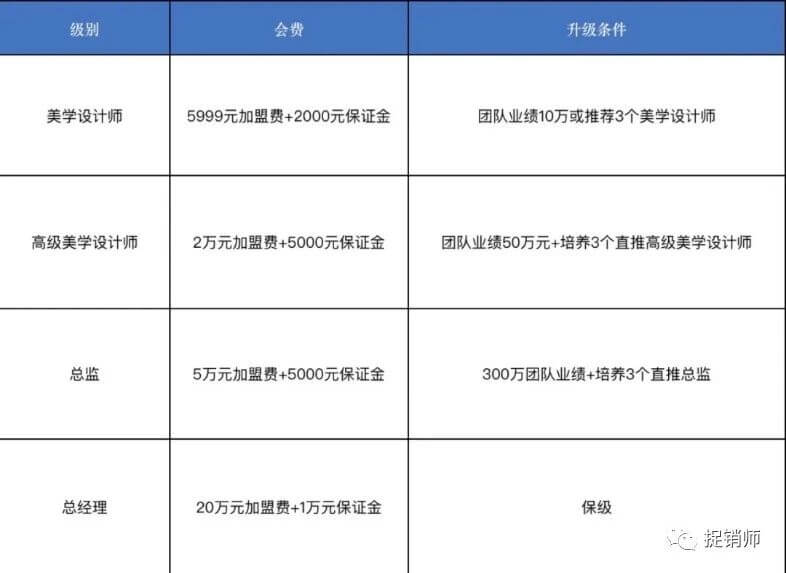 美学设计师:5999元加盟费+2000元保证金,升级条件为团队业绩超10万推荐3个美学设计师;