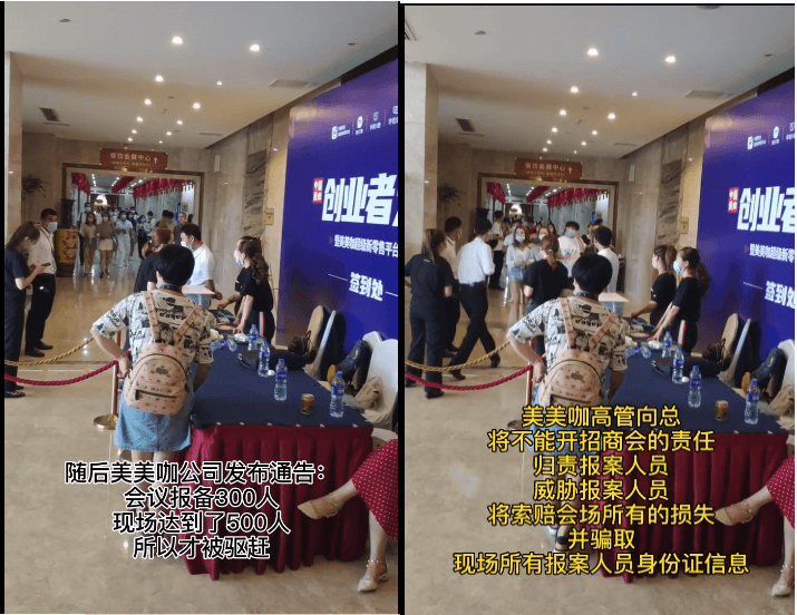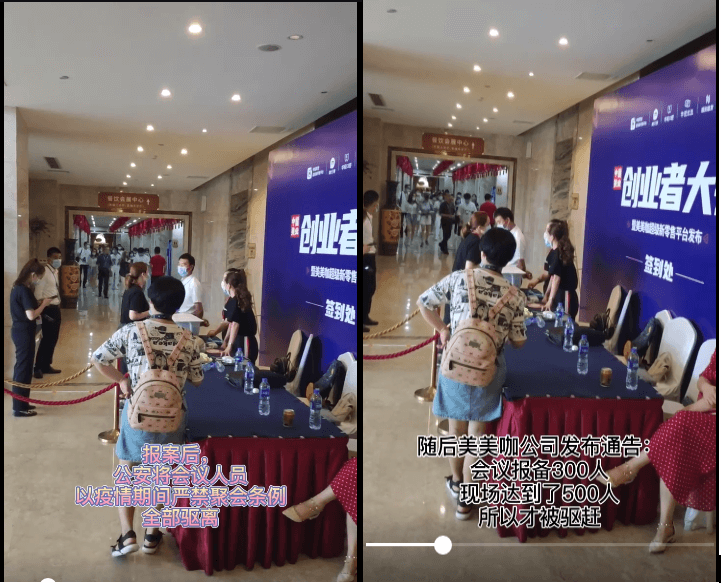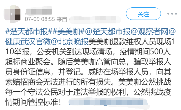 博文中写道:美美咖退款维权人员现场110举报,疫情期间举办500人超标商业聚会。公安机关到达现场清场,随后美美咖高管骗取举报人员身份信息,并登记。威胁在场举报人员,向其索赔招商会无法进行的所有损失。美美咖公然挑战每一个守法公民对于违法举报的权利,公然挑战疫情期间管控措施!