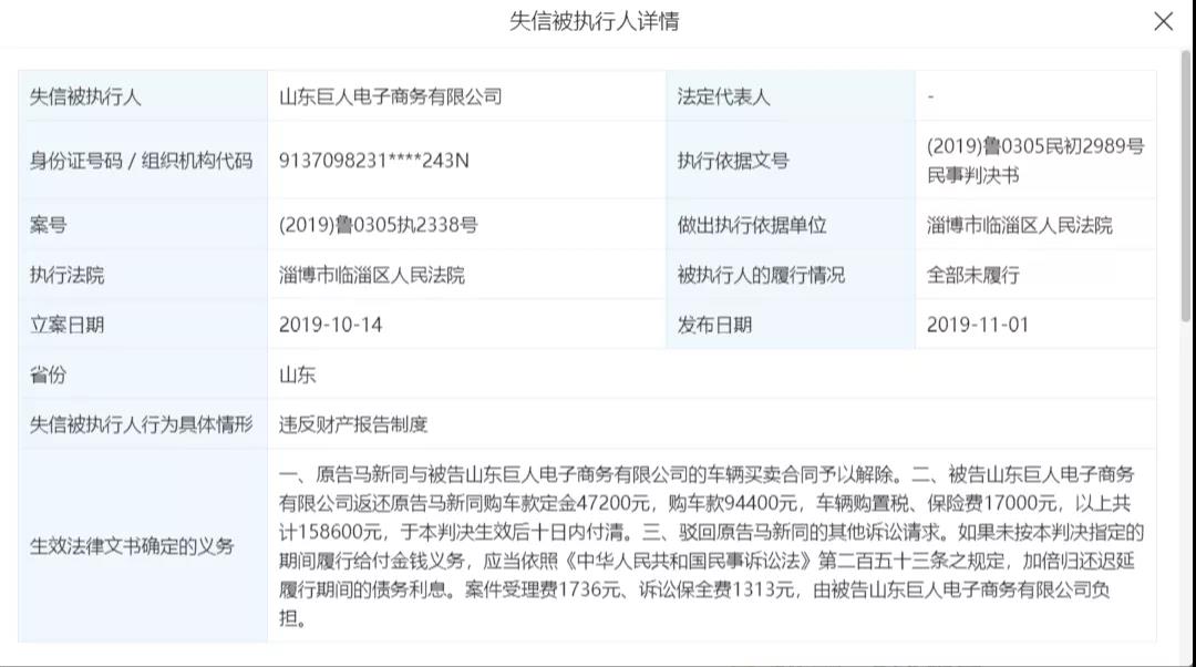 此外,该企业于2019年10月14日被淄博市临淄区人民法院列入“失信被执行人”,具体事由是“违反财产报告制度”:一、原告马新同与被告山东巨人电子商务有限公司的车辆买卖合同予以解除。二、被告山东巨人电子商务有限公司返还原告马新同购车款定金47200元,购车款94400元,车辆购置税、保险费17000元,以上共计158600元,于本判决生效后十日内付清。三、驳回原告马新同的其他诉讼请求。如果未按本判决指定的期间履行给付金钱义务,应当依照《中华人民共和国民事诉讼法》第二百五十三条之规定,加倍归还迟延履行期间的债务利息。案件受理费1736元、诉讼保全费1313元,由被告山东巨人电子商务有限公司负担。