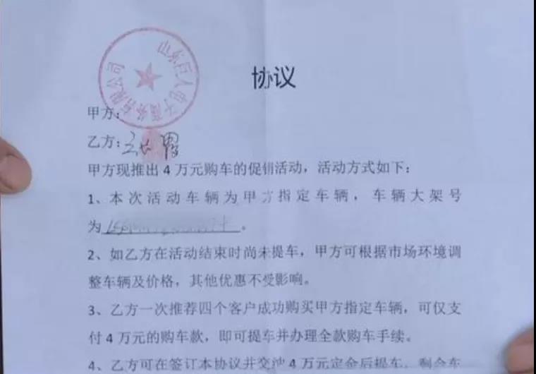 当时在购买这台车时,李大哥还通过介绍人参加了一个优惠活动,介绍人同时发展四个人一起买车,这四个人可以只支付四万元首付就可以提车,而介绍人就可以免费提车。当时李大哥和朋友时先生也是看准了这一优惠才选择了这款车。但没想到办了40万元的贷款,却只提回来一辆20万元的车,这时候李大哥才觉得自己上当了。