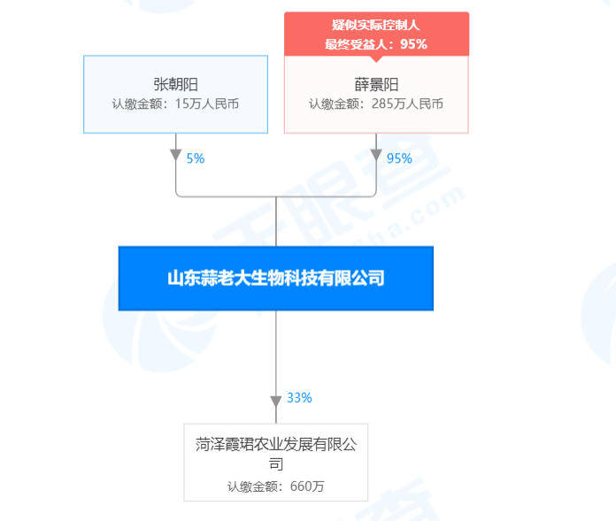 据天眼查显示,山东蒜老大生物科技有限公司(原名:巨野蒜老大生物科技有限公司)成立于2010年8月20日,注册资本为300万元,张朝阳担任法人、执行董事兼经理,其中薛景阳占股95%,张朝阳占股5%,其多个商标注册均是“蒜老大”。