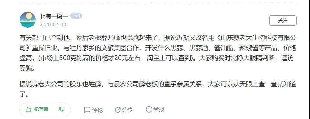 “山东晨农被有关部门调查后,幕后老板薛乃峰隐藏了起来,近期又改名用‘山东蒜老大生物科技有限公司’重操旧业,并与牡丹家乡的文旅集团合作,开发黑蒜、黑蒜酒、酱油醋、辣椒酱等产品,其价格也虚高。”据相关人士透露:“蒜老大薛景阳与晨农的薛乃峰很可能是直属关系。”