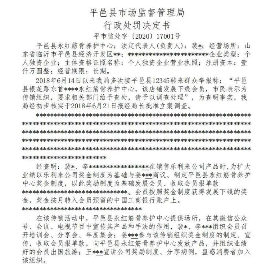 值得注意的是,近日山东省临沂市平邑县市场监督管理局公布一份行政处罚决定书,平邑县永红筋骨养护中心裴某、李某在销售乐利来公司产品时,为扩大业绩以乐利来公司奖金制度为基础制定平邑县永红筋骨养护中心奖金制度,以此奖励制度为基础发展会员、收取会员报单款。该活动涉嫌传销平邑县永红筋骨养护中心被平邑县市场监督管局罚没2173万余元。