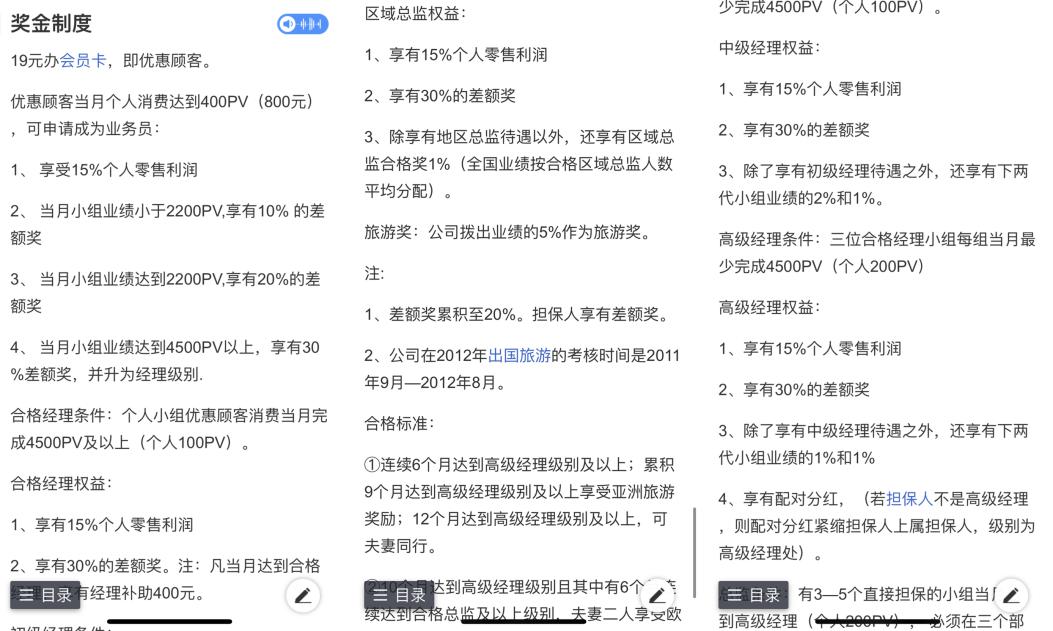 乐利来国际公司赵某芳(自称在乐利来国际公司6年,目前级别是地区总监)在制度讲解中称,花19元注册成为公司会员,即可享受拿货8.5折,发展团队奖金提成可拿到下线8代。奖金制度分为A、B、C三个区,也就是直推3人为一组,例如:消费3万元的产品,可返点6000元左右,再发展第一代可拿奖金提成7%,第二代11%,第三代5%,第四代3%,第五代2%,六代、七代、八代各拿1%,奖金制度模式呈金字塔结构,涉嫌多层次团队计酬。