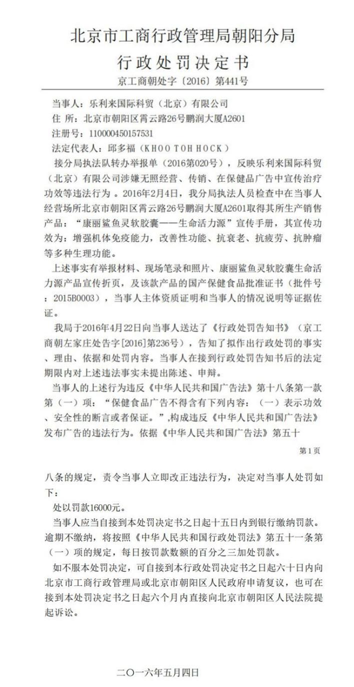 北京市工商行政管理局朝阳分局于2016年5月4日,京工商朝处字{2016}第441号决定书文号显示:因乐利来国际公司广告主发布含有表示功效、安全性的断言或者保证的保健食品广告,依据《中华人民共和国广告法》第五十八条的规定进行处罚16000元。