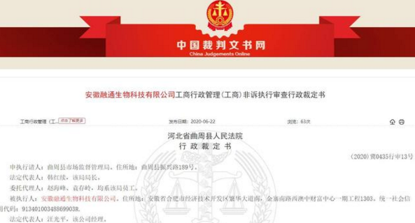 中国裁判文书网2018年11月发布的行政裁定书显示,曲周县市场监督管理局在查处被申请人安徽融通生物科技有限公司等涉嫌组织领导传销一案中,为防止被申请人转移或隐匿违法资金,于2018年8月20日向河北省曲周县人民法院申请冻结被申请人的帐户。