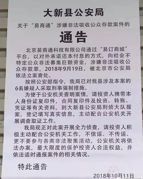 2018年10月11日,大新警方紧急发布通告:“易商通”涉嫌非法吸收公众存款6名涉案嫌疑人被采取刑事强制措施,同时呼吁被害人尽快报案!