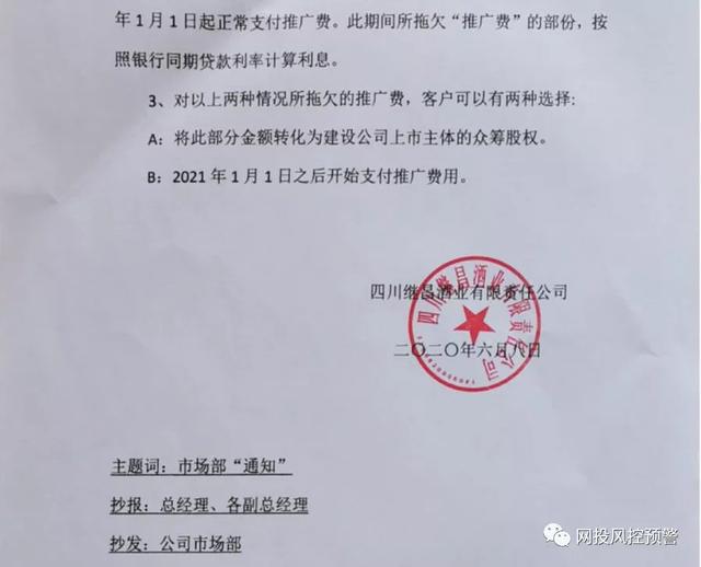 针对张女士以及众多受害人所拖欠的推广费,继昌酒业给出了两种选择:1、将此部分金额转化为建设公司上市主体的众筹股权。2、2021年1月1日后开始支付推广费用。