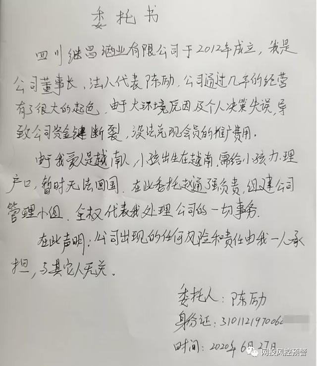 2020年6月27日,继昌酒业陈励亲笔书写的一份委托书。