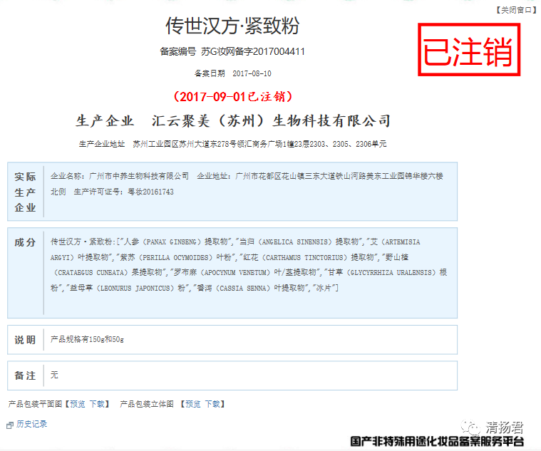 2017年8月10进行非特备案的传世汉芳紧致粉也于2017年9月1日注销。