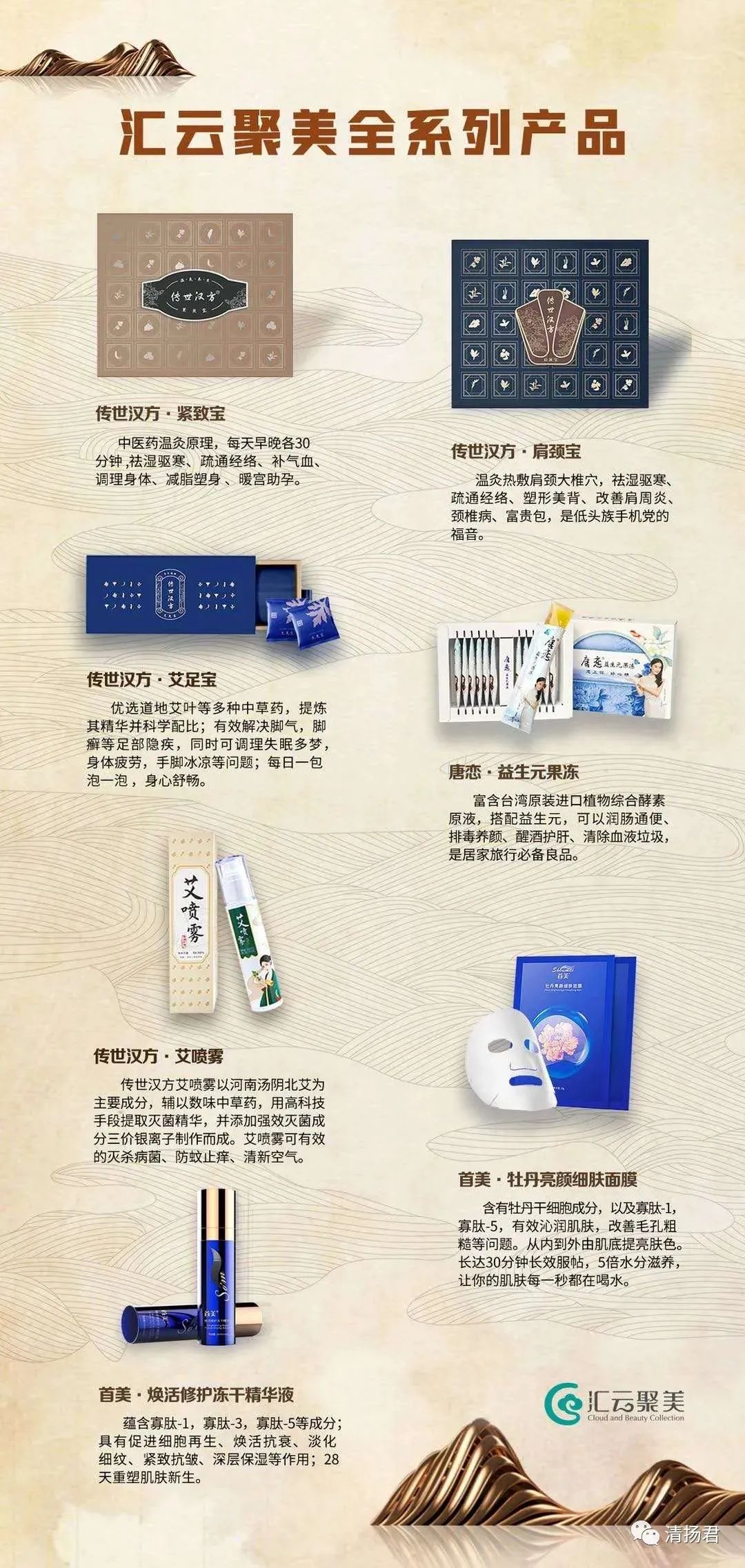 由于涉及汇云聚美微商的信息量比较多,清扬君准备以连载的形式,慢慢地为大家揭开汇云聚美的神秘面纱,本篇先从产品说起。