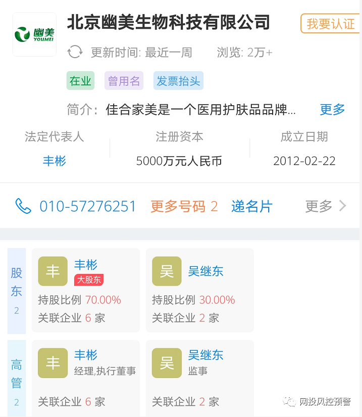 北京幽美生物科技有限公司(以下简称“幽美生物”)成立于2012年2月,法人代表丰彬,持股70%;监事吴继东,持股30%。