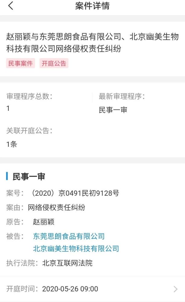 2020年5月26日,东莞思朗食品有限公司和北京幽美生物科技有限公司因网络侵权责任纠纷被赵丽颖告上法庭。