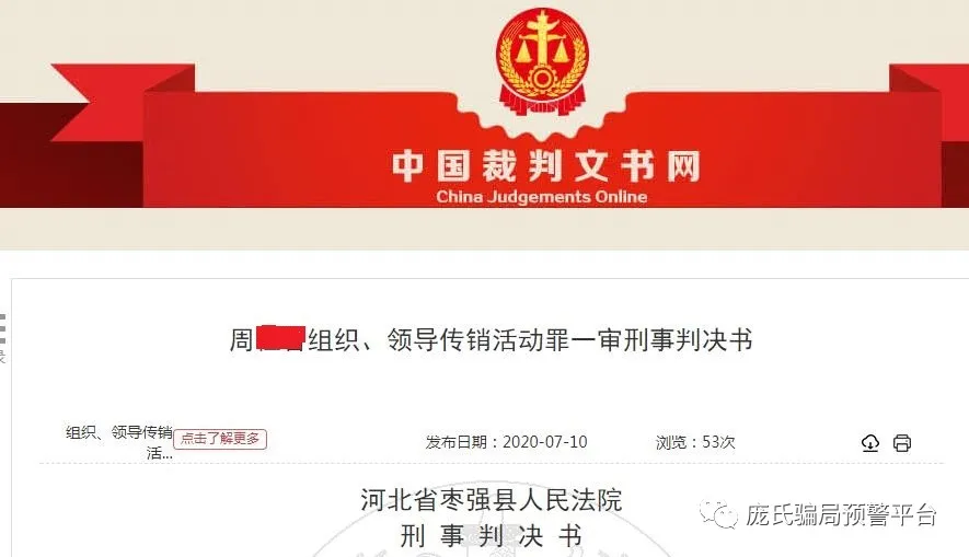7月10日,河北省衡水市枣强县人民法院对外披露了一起网络传销案的判决书。庞氏骗局预警平台在该判决书上看到,河北省衡水市冀州区男子周某某因参与“中国华尔街”传销项目,发展下线数十人构成犯罪被判处有期徒刑并处罚金。