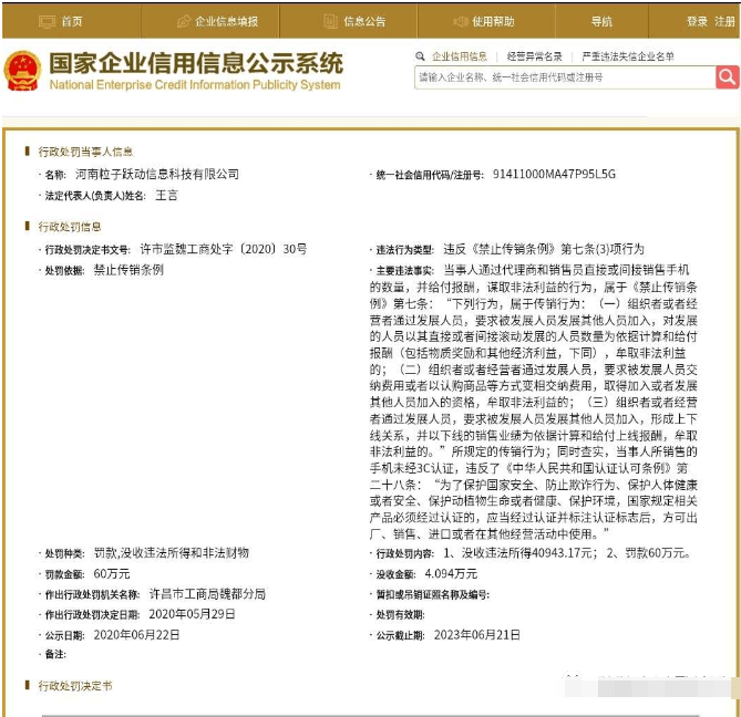 违法行为类型: 违反《禁止传销条例》第七条(3)项行为处罚依据: 禁止传销条例 主要违法事实: 当事人通过代理商和销售员直接或间接销售手机的数量,并给付报酬,谋取非法利益的行为,属于《禁止传销条例》第七条:“下列行为,属于传销行为:(一)组织者或者经营者通过发展人员,要求被发展人员发展其他人员加入,对发展的人员以其直接或者间接滚动发展的人员数量为依据计算和给付报酬(包括物质奖励和其他经济利益,下同),牟取非法利益的;(二)组织者或者经营者通过发展人员,要求被发展人员交纳费用或者以认购商品等方式变相交纳费用,取得加入或者发展其他人员加入的资格,牟取非法利益的;(三)组织者或者经营者通过发展人员,要求被发展人员发展其他人员加入,形成上下线关系,并以下线的销售业绩为依据计算和给付上线报酬,牟取非法利益的。”所规定的传销行为;同时查实,当事人所销售的手机未经3C认证,违反了《中华人民共和国认证认可条例》第二十八条:“为了保护国家安全、防止欺诈行为、保护人体健康或者安全、保护动植物生命或者健康、保护环境,国家规定相关产品必须经过认证的,应当经过认证并标注认证标志后,方可出厂、销售、进口或者在其他经营活动中使用。”处罚种类: 罚款,没收违法所得和非法财物 行政处罚内容: 1、没收违法所得40943.17元;2、罚款60万元。罚款金额: 60万元 没收金额: 4.094万元作出行政处罚机关名称: 许昌市工商局魏都分局 暂扣或吊销证照名称及编号: 作出行政处罚决定日期: 2020年05月29日 处罚有效期: 公示日期: 2020年06月22日 公示截止期: 2023年06月21日