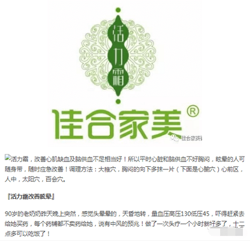 据中国质量新闻网报道,佳合家美“莱蔓仙姿”活力霜、平衡霜针对腰间盘突出、肾结石、骨刺骨膜炎、修复心间隔膜、甲状腺炎、甲状腺结节肿大、静脉曲张、股骨头坏死、帕金森病、强制性脊椎炎、面瘫、盆腔炎、小腿萎缩、老年痴呆等等有“神奇功效”。“量子顶级科技+中草药,中西医结合,疗效快,治标又治本。”