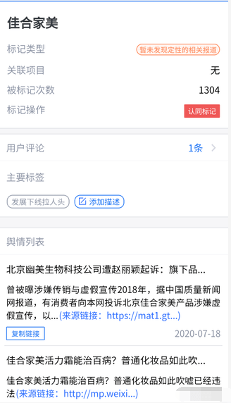 此外,在知乎或是贴吧等论坛,有关幽美、佳合家美传销的投诉可谓不绝。在腾讯旗下灵鲲金融风险查询平台显示,佳合家美尽管目前暂未发现定性的相关报道,但是依旧被网友标记达1304次,主要标签为“发展下线拉人头”。有网友评论写到,其母亲已被洗脑对此深信不疑,自己和父亲无论如何也劝不回来,希望有关部门落实核查。