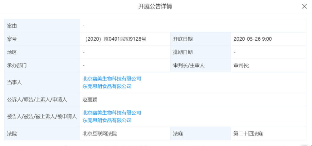 此次被赵丽颖起诉的公司不仅有北京幽美公司,还有另外一家名为东莞思朗食品有限公司。