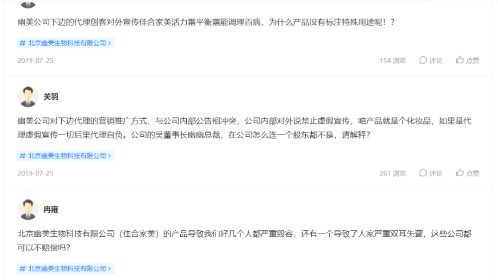 社交财经还注意到,去年5月,广西省消费者李某琳在黑猫投诉上表示,2018年4月份,经过朋友推荐李某琳做了北京幽美生物科技有限公司产品代理,2018年5月开了一家养生馆,店铺开在岑溪市义州四街75号,后来在2018年11月份公司推出了一款暧美人活力修复医用面膜,李某琳用了一个多月后脸上出现了非常严重的又红又肿又痒又流黄水等问题。