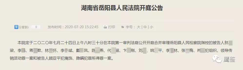 7月22日(明天)和7月24日上午8点30分,湖南省岳阳市岳阳县人民法院第一审判法庭将分别公开开庭审理“东霖国际”特大网络传销案。张某玲、廖某辉、刘某丁等44名被告人将接受法律的正义审判。