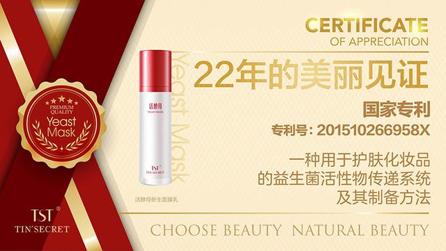 以“活酵母”新生面膜乳为例,“TST庭秘密”官方介绍其含有啤酒酵母菌、乳酸提取物及乳酸杆菌/北美圣草成分,具有修护肌肤的能力,可滋润肌肤补充水分,唤靓肌肤年轻态、重现水润透亮。宣传页面显示,“活酵母”拥有国家专利,是一种用于护肤化妆品的益生菌活性物传递系统及其制备方法。