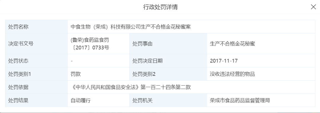 2017年11月17日,中食生物(荣成)科技有限公司生产不合格金花秘蜜案被荣成市食品药品监督管理局罚款以及没收违法经营的物品。