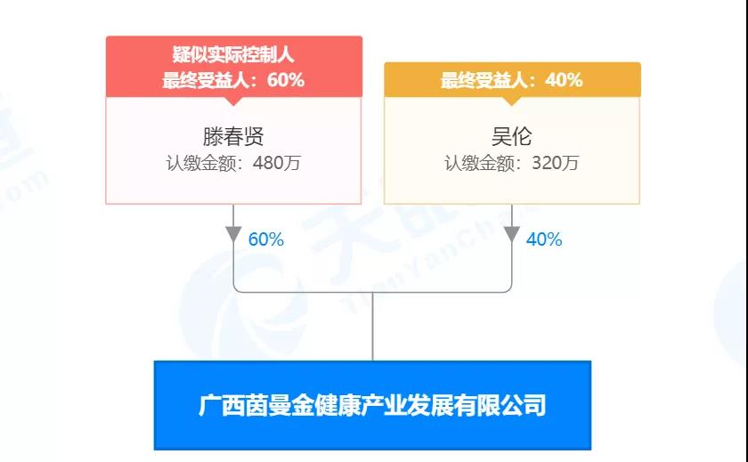据天眼查显示,广西茵曼金健康产业发展有限公司成立于2004年8月31日,注册资本为800万元,滕春贤担任法人与经理,占股60%,吴伦担任监事,占股40%。