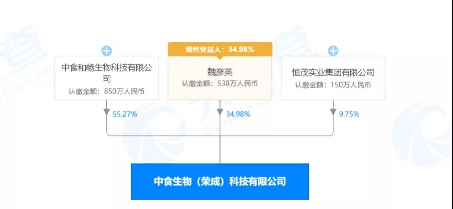 据天眼查显示,中食生物(荣成)科技有限公司成立于2013年1月4日,实缴资本为688万元,马占平担任法人、执行董事兼经理。其中,中食和畅生物科技有限公司占股55.27%,魏彦英占股34.98%,恒茂实业集团有限公司占股9.75%。