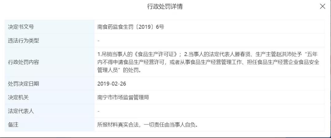 2019年2月26日,南宁市市场监督管理局吊销当事人的《食品生产许可证》,当事人的法定代表人滕春贤、生产主管赵洪沛处予“五年内不得申请食品生产经营许可,或者从事食品生产经营管理工作、担任食品生产经营企业食品安全管理人员”的处罚。