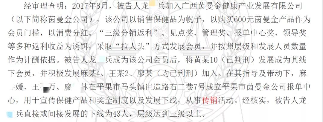 据《刑事判决书》显示,2017年8月,被告人龙某兵加入茵曼金公司成为会员后,随即将黄某10等人发展成为其线下会员,后为获利积极发展麻某4、王某2、廖某加入茵曼金公司,并组织、领导麻某媛、王某万、廖某林在平果市马头镇岜造路右二巷7号成立平果市茵曼金公司报单中心,用于宣传保健产品和奖金制度以及发展下线,从事传销活动。