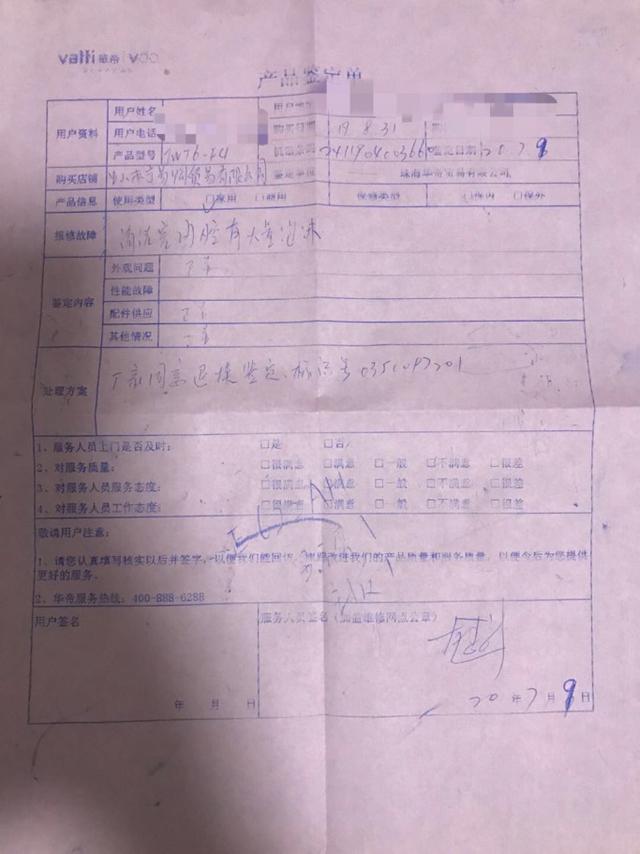 6月30日陈女士再次投诉后,7月2日维修师傅再次上门后仍未修好。最终,华帝在7月9日给陈女士开具了厂家退换的产品鉴定单,不过华帝方面希望“陈女士自己找苏宁沟通退换货”。