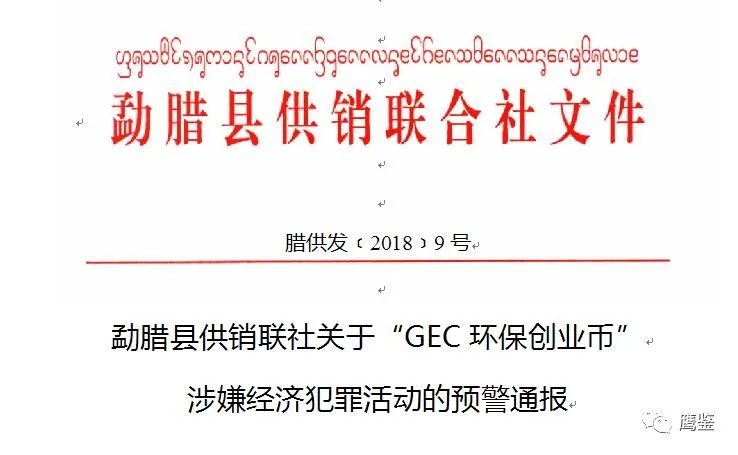 鹰鉴了解到,早在2018年5月22日,西双版纳州勐腊县供销联社就对“GEC环保创业币”涉嫌经济犯罪活动发布了预警通报。该通报全文如下: