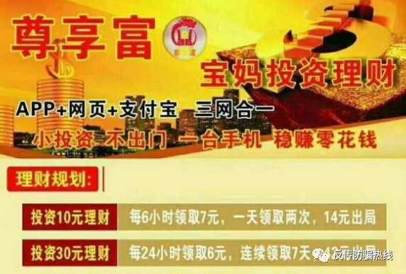 其中“尊享理财”模式为“10+30”理财模式,会员收益分静态收益和动态收益两种,静态收益为会员投资10元钱,每6小时返还7元(本息合计),每天返2次,本息合计返还14元,一天出局;会员投资30元钱,尊享富公司在7日内给投资人返还利润12元,7日内本息合计返还42元后出局。每个会员ID每天限买一单。