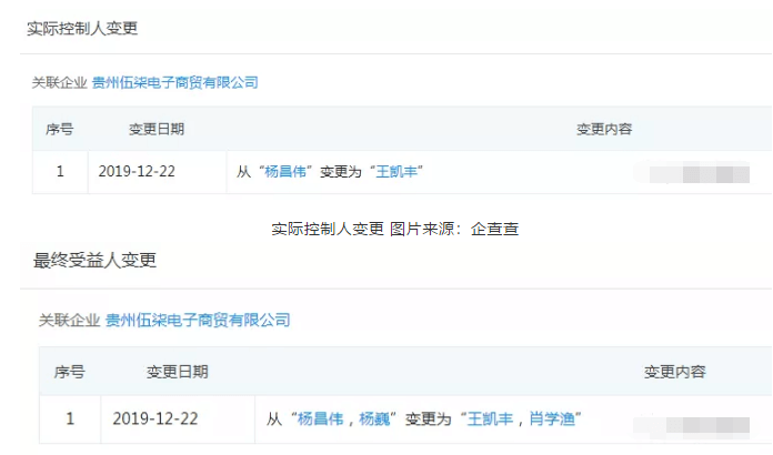 实际控制人于2019年12月22日,从杨昌伟变更为王凯丰。同时受益人也从“杨昌伟,杨巍”变更为“王凯丰,肖学渔”。