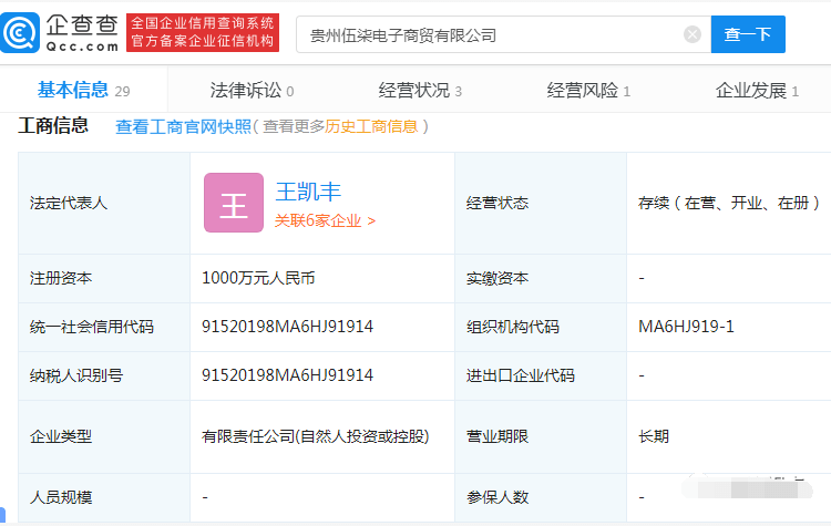 据悉,涉事的商城隶属于贵州伍柒电子商贸有限公司。舆情观察网搜索企查查显示,该公司成立于2019年1月29日,公司法人代表为王凯丰,从股权结构上同时也是公司实际控制人。具体职务为执行董事兼总经理。