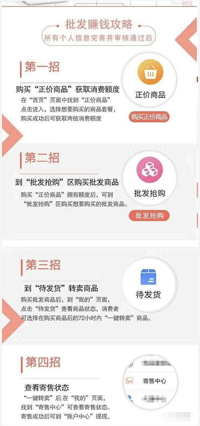 伍柒商城对外宣称注册的会员只要进行交易即可成为商家,运作模式分为正价区、批发区与寄售区三个环节。每10天为一个周期,平台每期推出的商品各有不同。会员注册后,先在正价区以标价购买商品,得到商品的同时,商城返还该商品消费金额的1.6倍批发额度。接着,会员可以用批发额度在批发区以正价的1~3折批发商品转入寄售区,成为下一期正价区商品,由平台代售。商城届时收取销售利润20%的手续费,本金和利润将返还到会员的余额钱包,可随时提现。