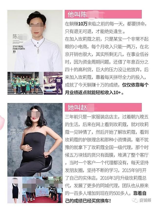 代理商陈某的故事中写道:......后来加入玫莉蔻,靠着每天拼尽全力的投入,成就了今天躺赚10万的成绩,仅仅依靠每个月业绩返点就能轻松收入10+。