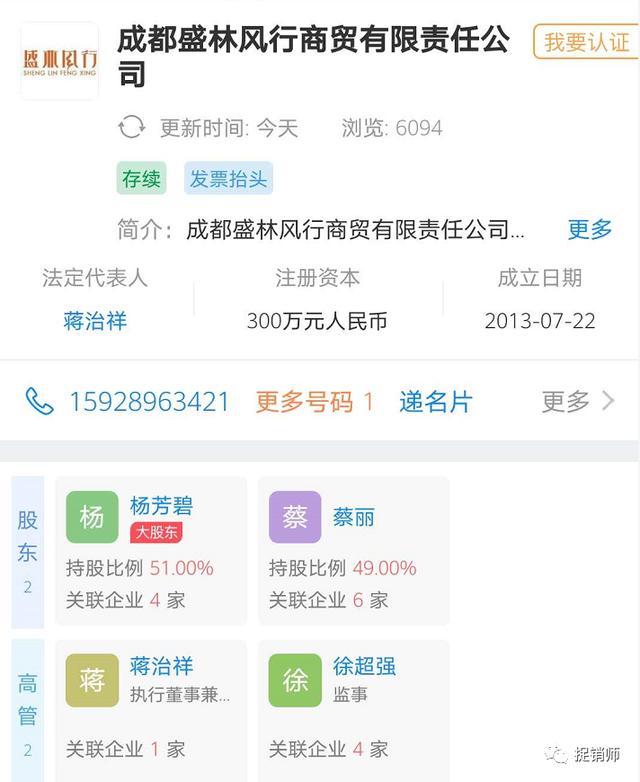 成都盛林风行商贸有限责任公司成立于2013年,法人蒋治祥,股东杨芳碧(持股51%);蔡丽(持股49%)。