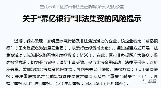 7月29日,重庆市梁平区打击非法金融活动领导小组办公室通过梁平日报发布《关于“幕亿银行”非法集资的风险提示》。该风险提示表示,近期,我市发现一家明显涉嫌传销及非法集资活动的企业,该企业名为“幕亿银行”(工商登记名为满星云集团),以发行虚拟货币为噱头,通过授课方式开展非法集资活动,忽悠群众购买境外虚拟货币(MSC)。