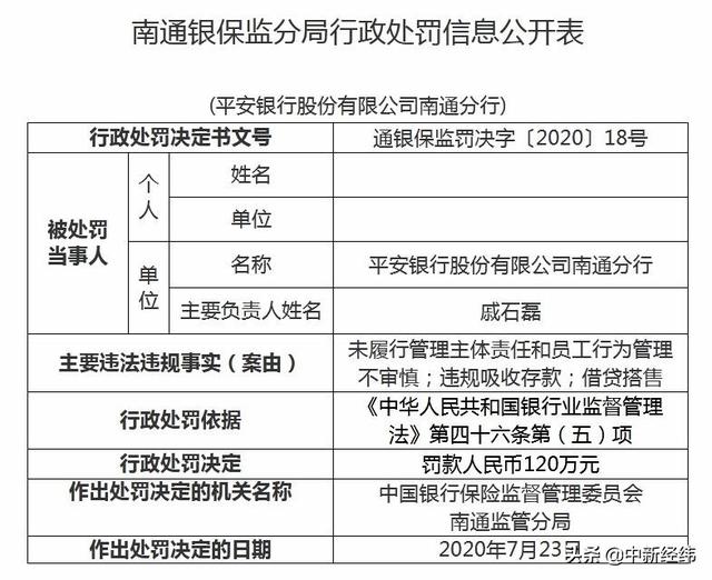 行政处罚决定书显示,因存未履行管理主体责任和员工行为管理不审慎;违规吸收存款;借贷搭售违法违规事实,依据《中华人民共和国银行业监督管理法》第四十六条第(五)项,7月23日,中国银保监会南通监管分局决定,对平安银行股份有限公司南通分行处以罚款人民币120万元。