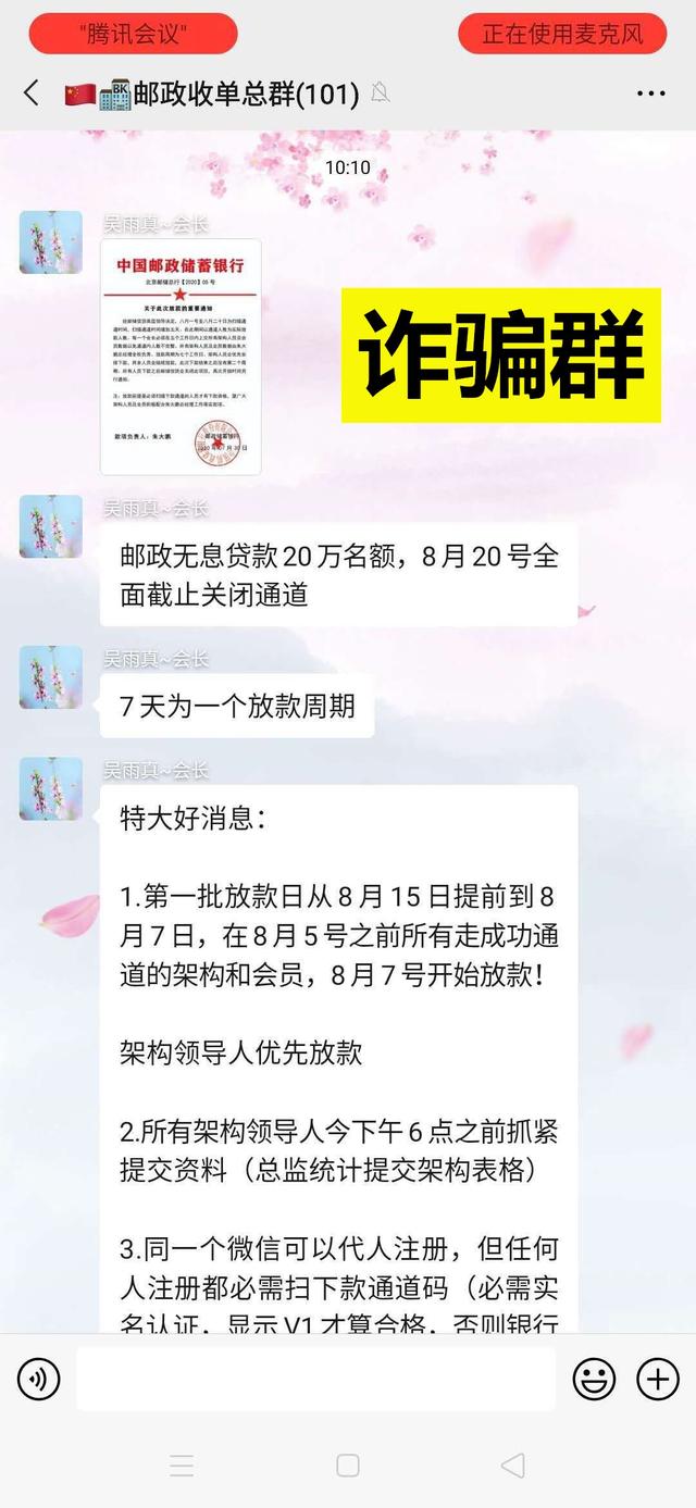 接到粉丝咨询:你好 现在不少群发展会员 宣导邮政储蓄发放50万5年无息贷款 要20万会员下载某某短视频 ,是不是骗局?