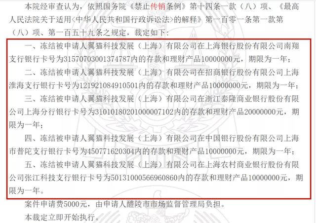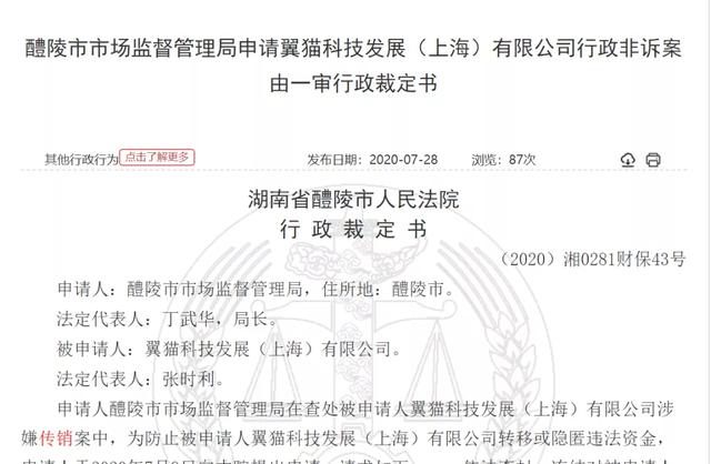 据该《行政裁定书》显示,醴陵市市场监督管理局在查处被申请人翼猫科技发展(上海)有限公司涉嫌传销案中,为防止被申请人翼猫科技发展(上海)有限公司转移或隐匿违法资金,申请人于2020年7月9日向本院提出申请,请求如下: