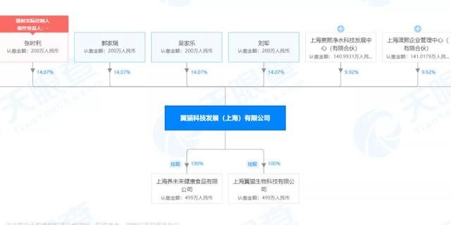 据天眼查显示,翼猫科技发展(上海)有限公司成立于2010年7月27日,实缴资本为1000万元,张时利担任董事长,吴家乐担任董事兼总经理,该公司最大股东是刘志伟、张时利、郭家瑞、吴家乐、刘军分别占股14.07%。